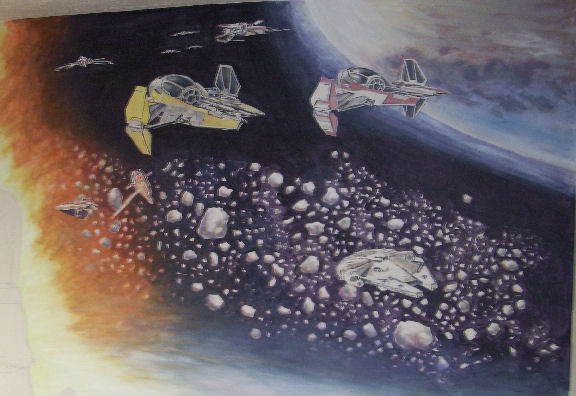 The final session involved completing work on the remaining spacecraft, which were mostly from the first Star Wars movie. Inevitably, I touched up bits of the mural here and there - I could very easily spend several hours working on various details to make them more realistic, but this would not necessarily enhance the overall effect. You have to stop somewhere!